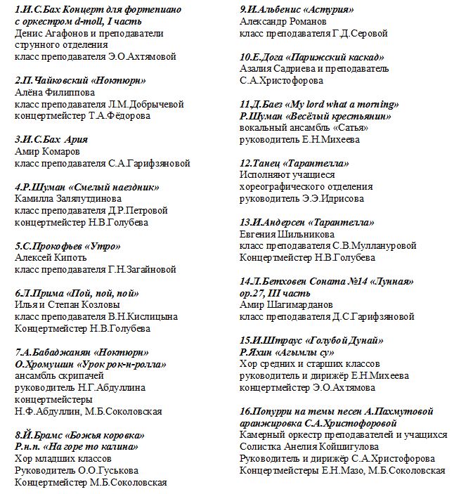 На одном дыхании выступили коллективы музыкальной школы. Трогательно и проникновенно прозвучал «Ноктюрн» А. Бабаджаняна в исполнении ансамбля скрипачей. Порадовали своим успешным выступлением хоровые коллективы младших, средних и старших классов. Исполнение a capella вокального ансамбля «Satya» заворожил слушателей, а учащиеся хореографического отделения исполнили зажигательный танец «Тарантелла».
