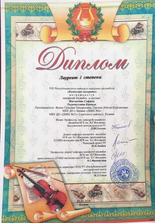 ПОЗДРАВЛЯЕМ ПОБЕДИТЕЛЕЙ VIII РЕСПУБЛИКАНСКОГО КОНКУРСА КАМЕРНЫХ АНСАМБЛЕЙ "КАЗАНСКАЯ КАМЕРАТА"