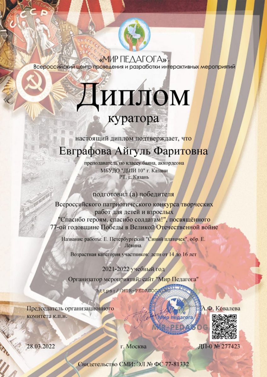 28.03.2022 года в г.Москве проходил Всероссийский патриотический конкурс творческих работ для детей и взрослых "Спасибо героям, спасибо солдатам!", который был посвящен 77-ой годовщине Победы в Великой Отечественной войне. МБУДО "Детская школа искусств №10" г. Казани представил учащийся народного отделения Батыршин Динар (класс преподавателя Евграфовой Айгуль Фаритовны) и стал лауреатом I степени. Поздравляем Динара и Айгуль Фаритовну с отличными успехами и желаем покорения новых творческих высот. Администрация школы выражает благодарность преподавателю Евграфовой А.Ф. за подготовку конкурсного номера, а также за воспитание патриотических чувств у подрастающего поколения.