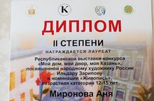 В г.Казань проходила Республиканская выставка-конкурс "Мой дом, мой двор, моя Казань", посвященная народному художнику России Ильдару Зарипову. В данной выставке-конкурсе представили свои работы учащиеся художественного отделения МБУДО "Детская школа искусств №10" г.Казани класса преподавателя Соловьевой Натальи Анатольевны. По результатам выставки-конкурса Миронова Анна была награждена дипломом II степени, а Евгеньев Михаил и Галиуллина Карина дипломами III степени. Поздравляем учащихся и преподавателя с отличными результатами выставки-конкурса и желаем дальнейших успехов.
