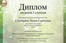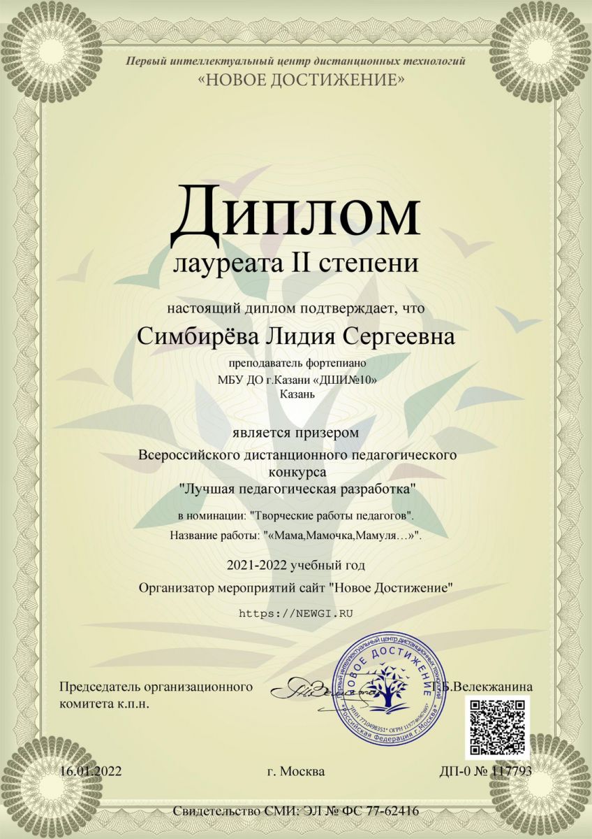 В г. Москва 16 января прошёл Всероссийский педагогический конкурс «Лучшая педагогическая разработка», в котором приняла участие преподаватель фортепианного отделения Симбирёва Лидия Сергеевна, в номинации «Творческие работы педагогов» и стала лауреатом 2 степени. Поздравляем Лидию Сергеевну с личной победой и желаем ей новых творческих успехов! Администрация школы выражает благодарность Лидии Сергеевне за труд.