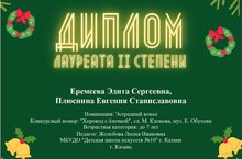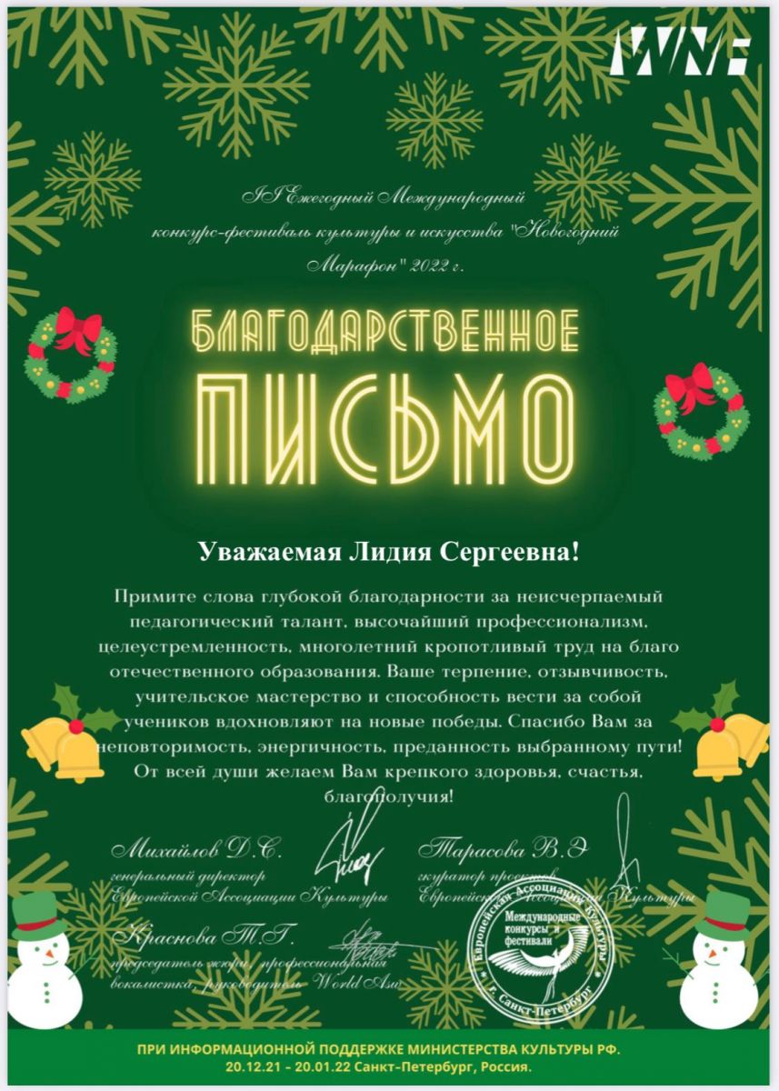 В г. Санкт-петербург проходил Ежегодный Международный конкурс-фестиваль культуры и искусства "Новогодний марафон" 2022, на котором МБУДО "ДШИ №10" г. Казани представили учащиеся хорового отделения. Дуэт в составе Еремеевой Эдиты и Плюсниной Евгении (класс преподавателя Жолобовой Л.И.) удостоился диплома лауреата 2 степени, а Семенова Маргарита стала лауреатом 3 степени. Поздравляем учащихся и их преподавателя Жолобову Лилию Ивановну с результатами конкурса и желаем дальнейших творческих успехов! Администрация школы благодарит преподавателя Жолобову Л.И. за подготовку учащихся к конкурсу.