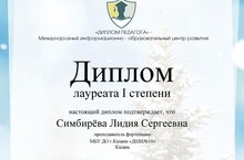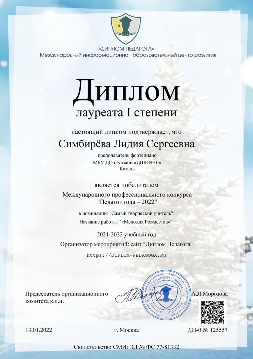 Поздравляем с личной победой преподавателя фортепианного отделения МБУДО "ДШИ №10" г. Казани Симбирёву Лидию Сергеевну, которая стала победителем Международного профессионального конкурса «Педагог года-2022» (г.Москва), в номинации «Самый творческий учитель»-лауреат 1степени.