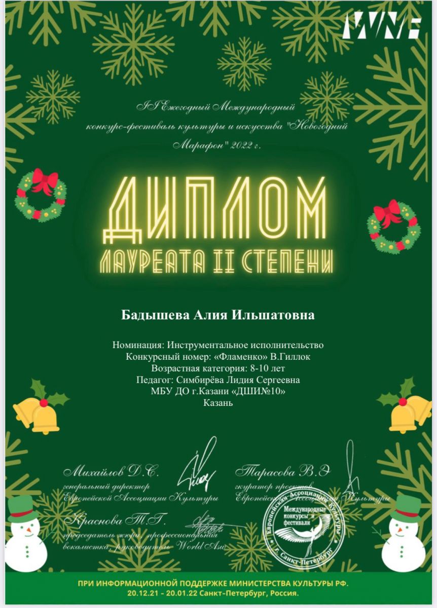 Ежегодный Международный конкурс-фестиваль культуры и искусства «Новогодний марафон»2022 принёс нашей школе ещё одну победу. Поздравляем ученицу 3 класса Бадышеву Алию (класс преподавателя Симбирёвой Лидии Сергеевны), которая стала лауреатом 2степени. Желаем Алие и ее преподавателю новых творческих побед. Благодарим преподавателя Лидию Сергеевну за подготовку к конкурсу учащейся.