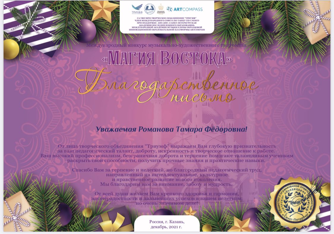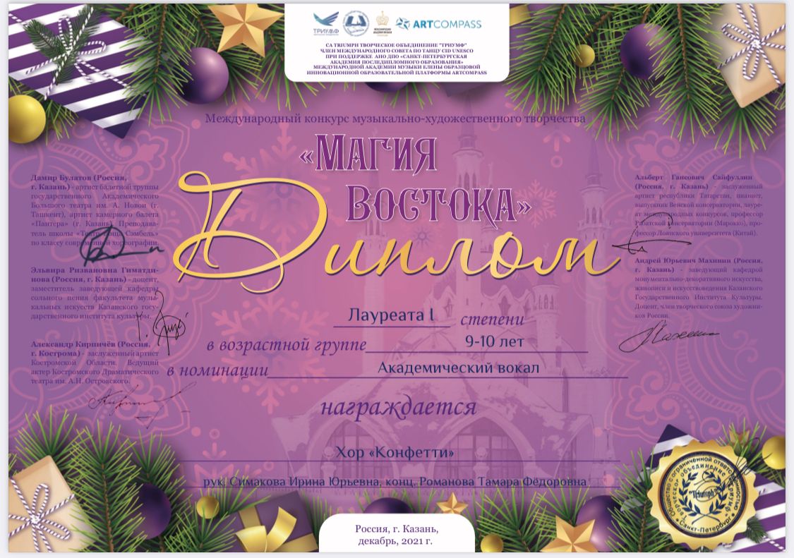 В г. Казани проходил Международный конкурс музыкально-художественного творчества «Магия востока», в котором нашу школу представил младший хор «Конфетти» (руководитель: Симакова Ирина Юрьевна, концертмейстер: Романова Тамара Федоровна). Поздравляем с победой - лауреаты 1 степени! Желаем ребятам и их преподавателям новых ярких побед! Благодарим Ирину Юрьевну и концертмейстера Тамару Фёдоровну за подготовку конкурсного номера. Администрация школы выражает благодарность Симаковой И.Ю. и Романовой Т.Ф. за труд.