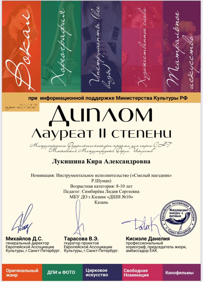 В г. Санкт-Петербург проходил Международный Федеральный конкурс-проект для стран СНГ «Московский Международный форум искусств», в котором МБУДО "ДШИ №10" г. Казани представила ученица 2класса Лукишина Кира (класс преподавателя Симбирёвой Лидии Сергеевны) и стала лауреатом 2 степени. Поздравляем Киру и ее преподавателя с успехом и желаем двигаться только вперёд к новым успехам! Администрация школы выражает благодарность Лидии Сергеевне за подготовку к конкурсу.