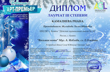 В городе Москва прошел Международный конкурс-фестиваль искусств "Новогодний АРТ-ПРЕМЬЕР". Организатором конкурса выступил продюсерский центр "AGL PRODUCTION". На этом конкурсе нашу школу представила учащаяся хорового отделения Камалиева Риана (класс преподавателя Жолобовой Л.И.). Риана стала обладательницей диплома Лауреата III степени. Поздравляем Риану и ее преподавателя Жодобову Л.И. с отличным результатом и желаем продолжать двигаться вперед к новым вершинам. Администрация школы выражает благодарность преподавателю Жолобовой Л.И. за подготовку учащейся к конкурсу.