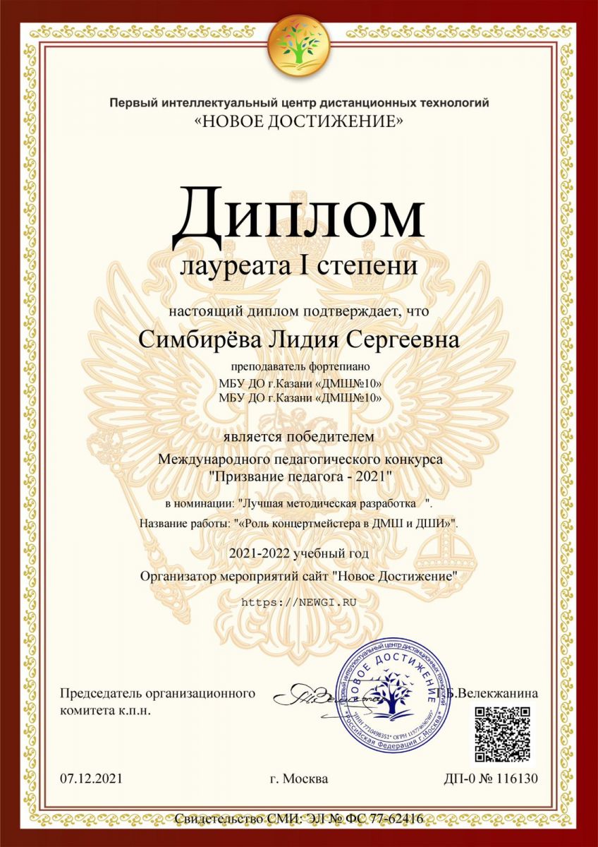 Преподаватель фортепианного отделения МБУДО г. Казани "ДМШ №10" Симбирёва Лидия Сергеевна стала победителем Международного педагогического конкурса «Призвание Педагога-2021», проходившего в г. Москва. Лидия Сергеевна завоевала диплом 1 степени в номинации «лучшая методическая разработка» с конкурсной работой «Роль концертмейстера в ДМШ и ДШИ». Администрация школы поздравляет преподавателя с личной победой и выносит благодарность за труд.