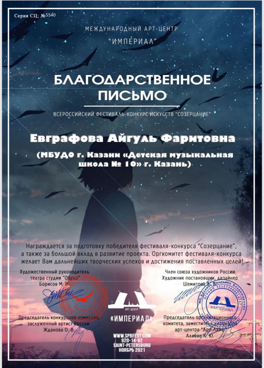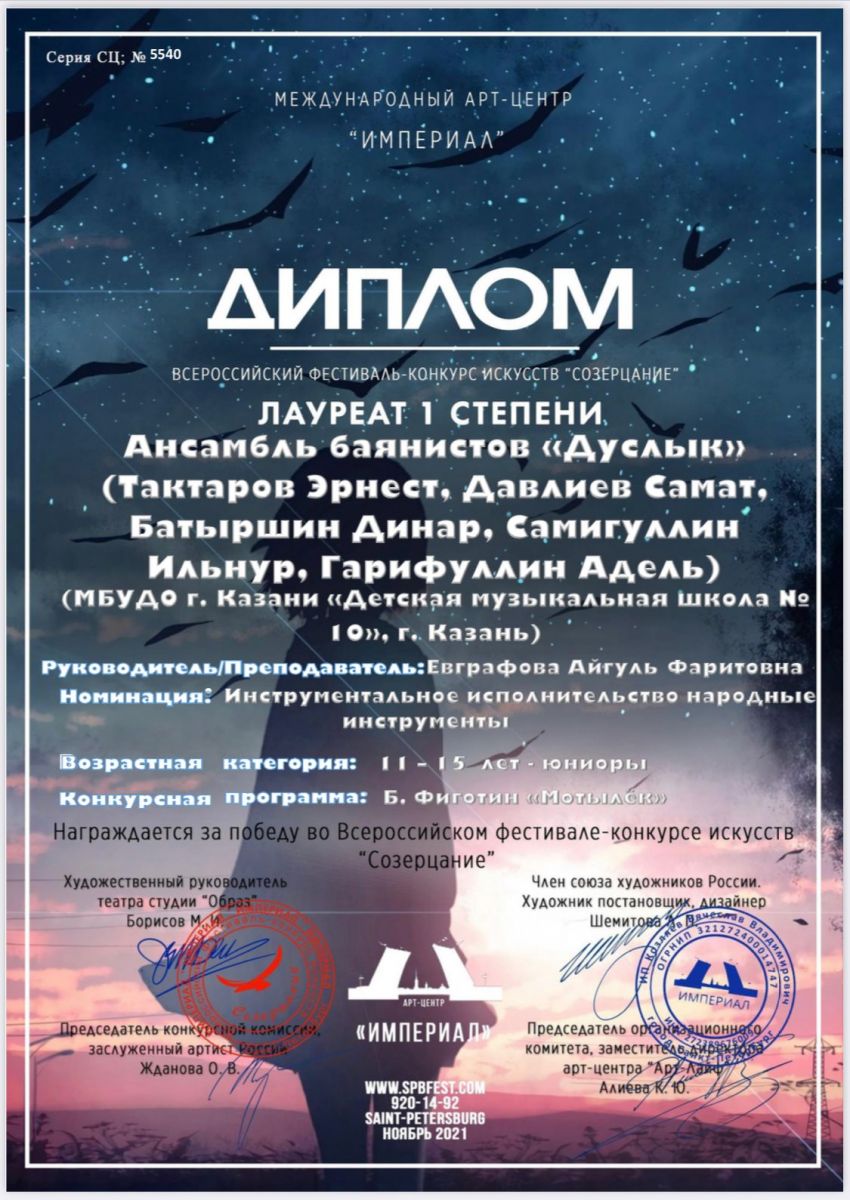 Во Всероссийском конкурсе-фестивале искусств «Созерцание», выступили учащиеся народного отделения МБУДО г. Казани "ДМШ №10". Ансамбль «Дуслык», под руководством Евграфовой Айгуль Фаритовны завоевал диплом лауреата 1 степени. Администрация школы поздравляет учащихся и их руководителя с победой и желает новых ярких побед, а также выносит благодарность преподавателю за подготовку конкурсного номера.