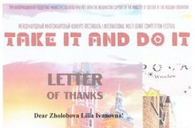 В Польше, г. Варшаве, состоялся Международный многожанровый конкурс-фестиваль "Тake it and do it" при информационной поддержке Министерства культуры Российской Федерации. На конкурсе нашу школу представляли ученицы: Гузаярова Ясмин, Иматдинова Амина, Камардина Алиса и Уразова Лейсан (класс преподавателя Жолобовой Лилии Ивановны). По итогам конкурса Гузаярова Ясмина, Иматдинова Амина и Уразова Лейсан стали обладателями диплома лауреата II степени, а Камардина Алиса удостоилась диплома III степени. Поздравляем учеников нашей школы и их преподавателя Жолобову Л.И. и желаем дальнейших творческих успехов! Администрация школы выражает благодарность преподавателю Жолобовой Л.И. за опдготовку учащихся к конкурсу.
