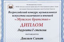 Поздравляем Давлиева Самата (класс преподавателя Евграфовой А.Ф.) с новой победой! На Всероссийском конкурсе музыкального искусства мальчиков и юношей "Мужское братство" Самат был награжден дипломом Лауреата I степени! Молодец!!!