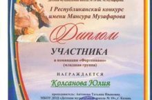 УЧАЩАЯСЯ ШКОЛЫ КОЛСАНОВА ЮЛИЯ (КЛАСС ПРЕПОДАВАТЕЛЯ АНТОНОВОЙ Т.И.) ПРИНЯЛА УЧАСТИЕ В I РЕСПУБЛИКАНСКОМ КОНКУРСЕ ИМЕНИ МАНСУРА МУЗАФАРОВА.
