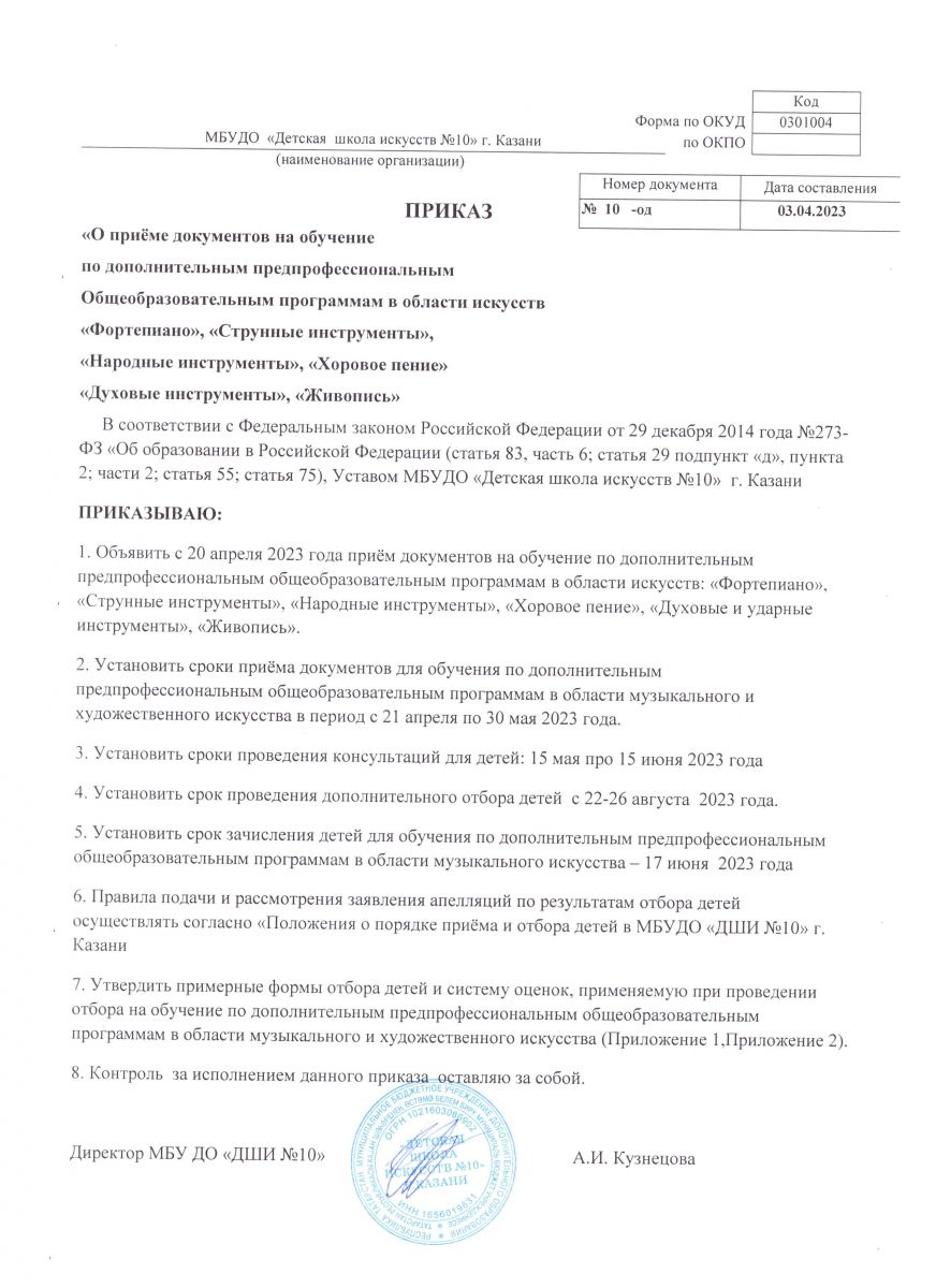 Приказ о зачислении на музыкальное отделение 2024-2025г