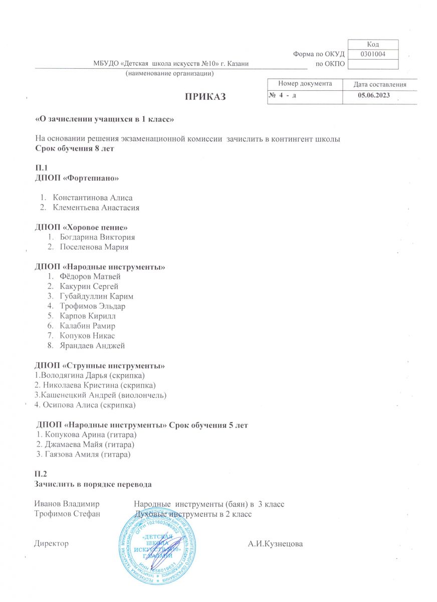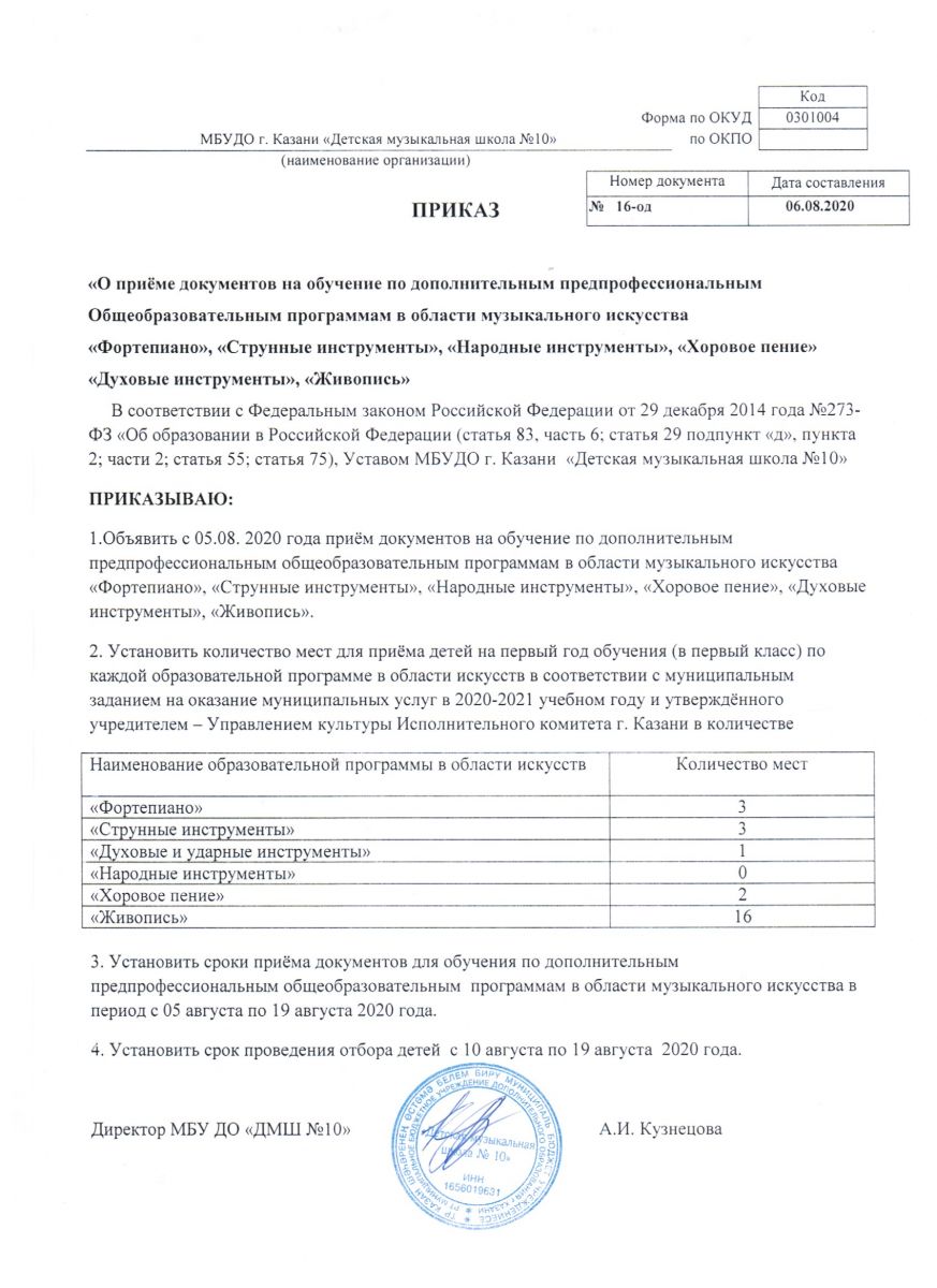 Приказ о зачислении учащихся в 1 класс на музыкальное отделение