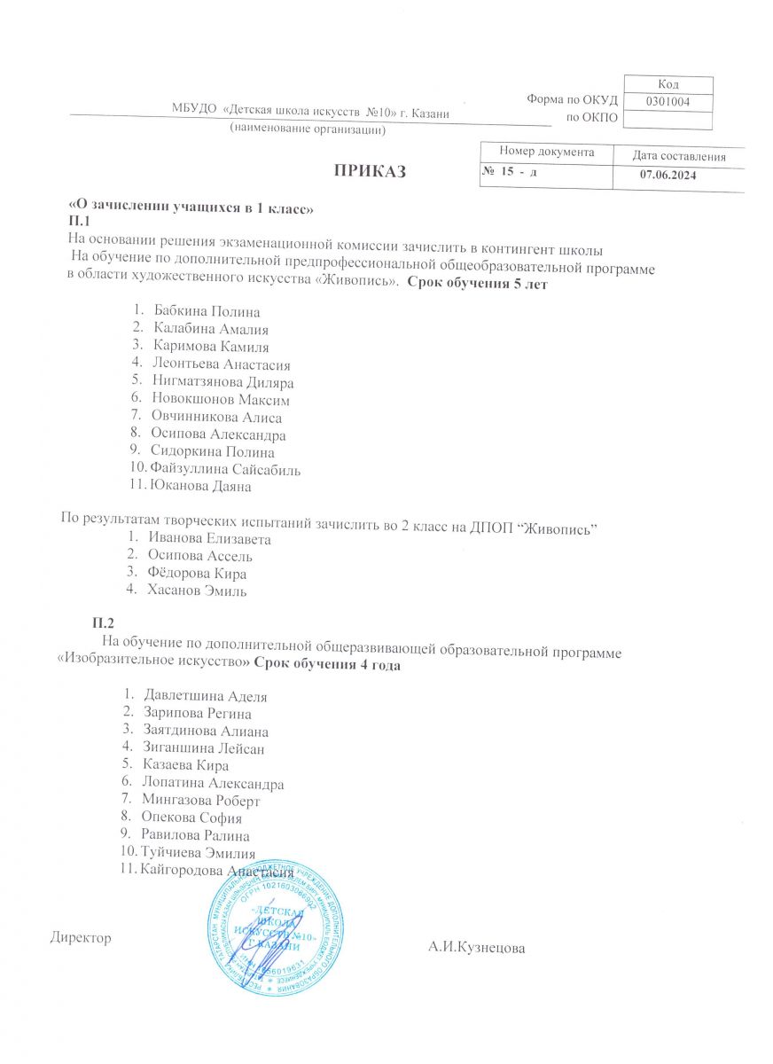 Приказ о зачислении на художественное отделение 2024-2025 г