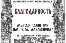 Благодарность МБУДО "ДХШ № 3 им.Б.М.Альменова" и учащимся школы за участие в выставке "Сны Алисы", организованной в честь премьеры спектакля "Алиса в стране чудес" в Марийском театре юного зрителя.