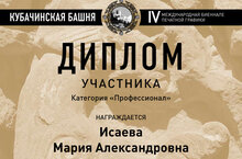 Дипломом удостоен преподаватель "ДХШ №3 им.Б.М.Альменова" г.Казани - Исаева Мария Александровна, которая приняла участие в IV Международном Биеннале печатной графики.