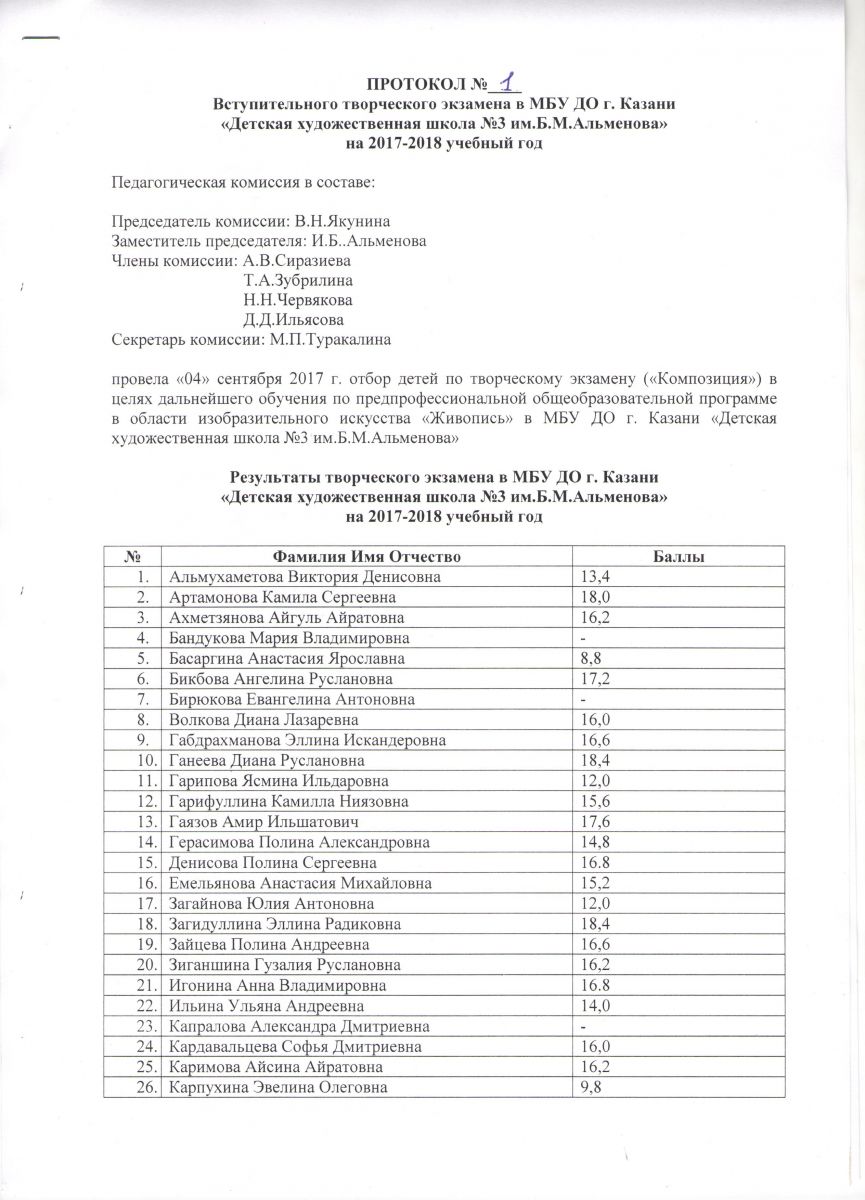 Протокол вступительного творческого экзамена на 2017 - 2018 учебный год: