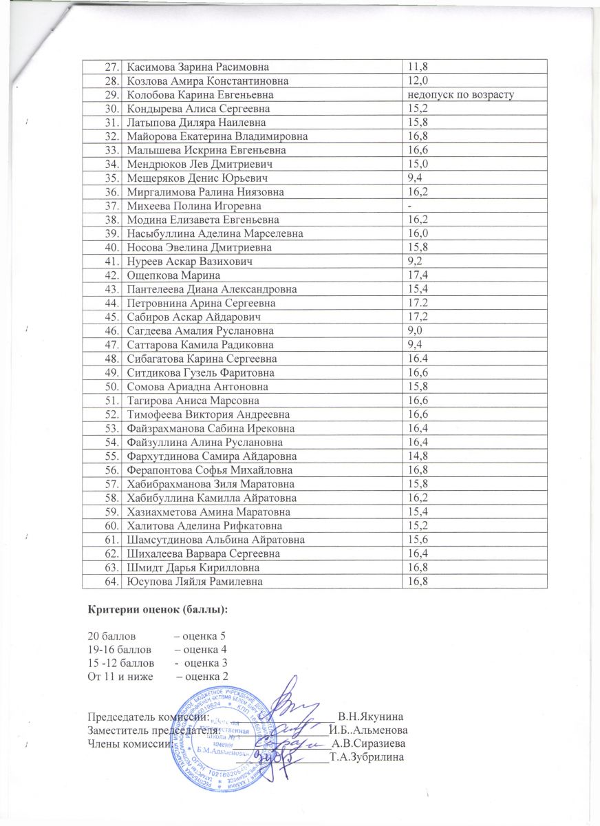Результаты вступительного экзамена на 2017 - 2018 учебный год