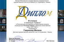 Диплом III место - Гаврикова Милена – 2 «В» класс (преп. В.Н. Якунина)