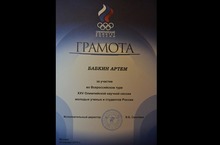 30 января студент ГБОУ СПО "Казанское училище олимпийского резерва" Бабкин Артём принял участие во Всероссийском туре ХХV Олимпийской научной сессии молодых ученых и студентов России, проходившей в г. Москве