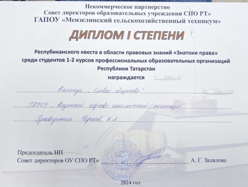 Опубликовано: 26.01.202426 января команда студентов «Сливки общества» ГАПОУ КТЭТ приняла участие в Республиканском квесте в области правовых знаний «Знатоки права» среди студентов 1-2 курсов профессиональных образовательных организаций Республики Татарстан. В конкурсе приняли участие представители 13 образовательных организаций РТ. Решением экспертной комиссии, команда «Сливки общества» — студенты группы ПКД 593 Полянин Илья, Нарутдинова Эрена, Горохова Ксения, признана командой ПОБЕДИТЕЛЕЙ и награждена дипломом 1 степени.