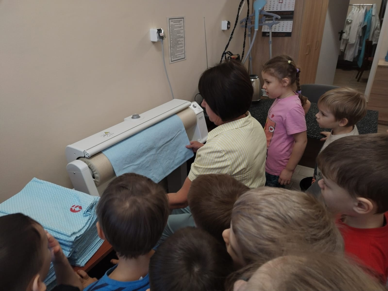 Ребята познакомились с профессией прачки и кастелянши, узнали, как много труда вложено, чтобы полотенца и постельное белье всегда были чистыми и аккуратно выглаженными.