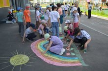 1 июня - День защиты детей в пришкольном лагере. У нас в гостях творческая группа Стрекоза с танцевально- игровой программой - "Прикатило на велике ЛЕТО". Дети после дискотеки с большим желанием участвовали в конкурсе рисунков на асфальте "Лучик солнца"