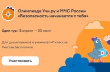 15 апреля — 30 июня включительно на платформе Учи.ру пройдет всероссийская бесплатная олимпиада «Безопасность начинается с тебя» для учеников 1–11 классов и дошкольников пяти-семи лет.
