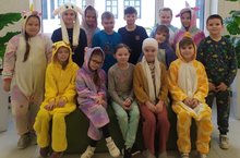 оказались на пижамной вечеринке – это забавная встреча друзей, когда все переодеваются в домашнюю одежду, кигуруми или пижамы. В нашем случае, учебный день проходит в таком уютном и домашнем наряде.