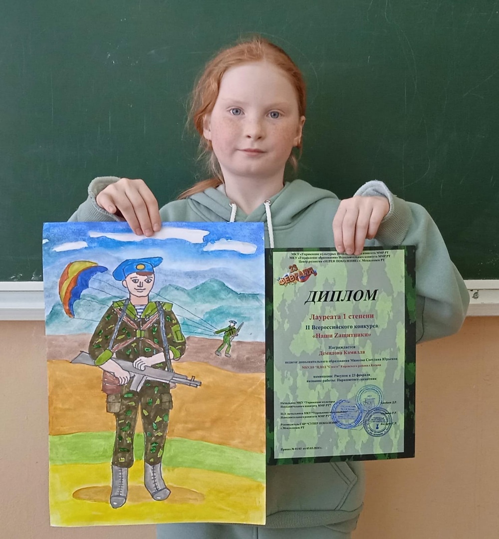 Также лауреатство 1 степени во II всероссийском конкурсе "Наши Zащитники" завоевали обучающиеся объединения ИЗО "Королева Кисточка": Хисамова Ясмина, Носырева Рамина, Демидова Ралина и коллективная работа студии дизайна "Радуга".