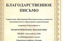 Педагогическому коллективу нашего детского сада было вручено благодарственное письмо от Управления образования Исполнительного комитета муниципального образования города Казани за успешный старт и стремление к успеху.