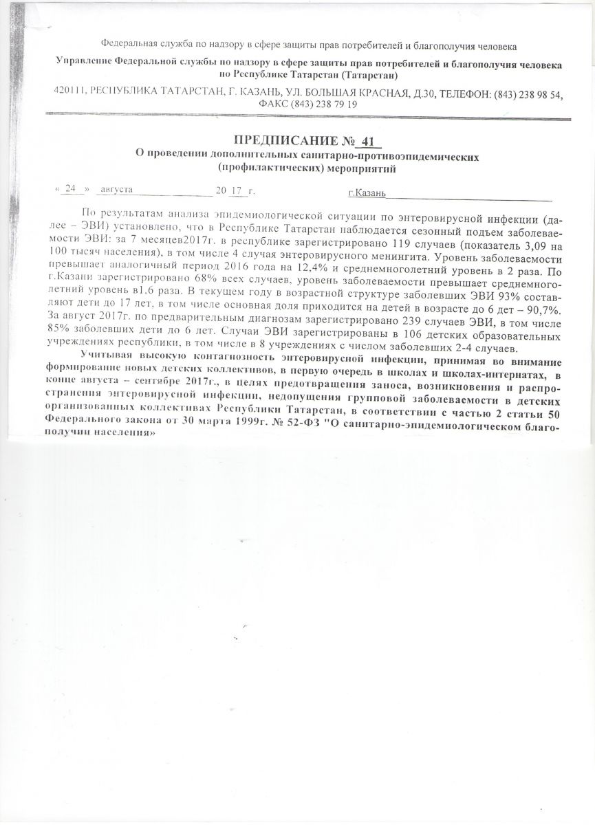 - Предписание о проведении дополнительных санитарно-противоэпидемических мероприятий 29.09.2017