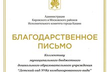 Коллективу детского сада вручено Благодарственное письмо Администрации Кировского и Московского районов Исполнительного комитета г.Казани за высокую результативность, активную, плодотворную работу и большой вклад в развитие системы дошкольного образования Кировского и Московского районов.