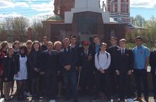 Традиционно учащиеся школы возносят гирлянду к памятнику Советским воинам