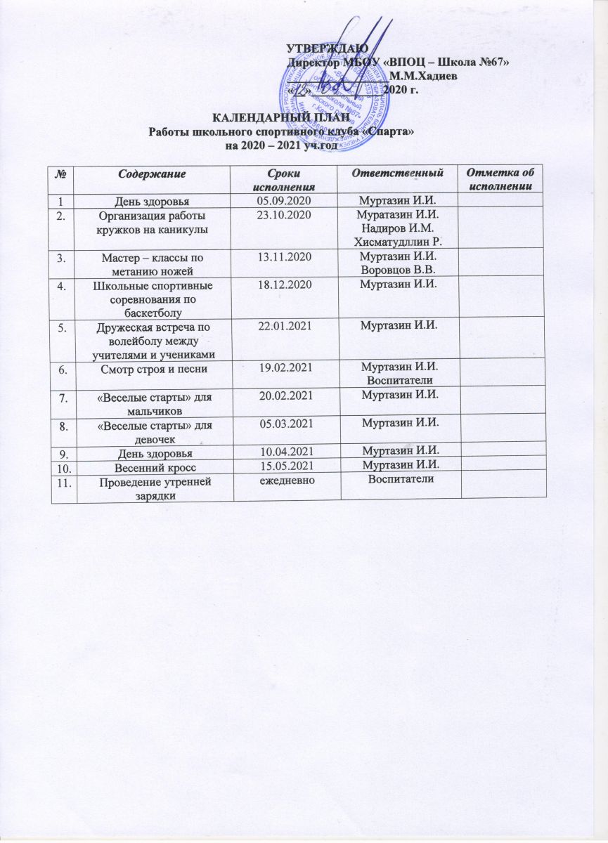 Календарный план работы ШСК "Спарта" на 2020-21 уч.год