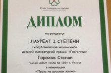 Ученика 7 А класса Горохова Степана, ставшего лауреатом I степени в Республиканской независимой детской литературной премии "Глаголица"