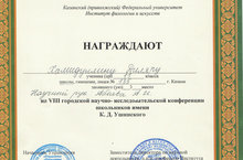 Поздравляем ученицу 11 класса Хамидуллину Диляру, занявшую 3 место в VIII городской научно- исследовательской конференции школьников им. К.Д. Ушинского