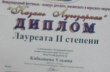 Поздравляем ученицу 4А класса Кабанову Ульяну, ставшую лауреатом II степени на Международном фестиваль- конкурсе детского, юношеского и взрослого творчества "Казань лучезарная"