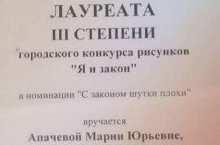 Сегодня прошло торжественное награждение победителей городского кункурса рисунков " Я и закон". Ученица 8Б класса Апачева М. и ученица 6А класса Камалова С. стали лауреатами III степени. Поздравляем с победой!