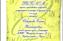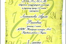 Дипломом наградили Латыпова Аделя (ученица 5 класса) за победу в международной олимпиаде по русскому языку.