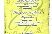 Дипломом наградили Гайнутдиноау Айгуль (ученица 7 класса) за победу в международной олимпиаде по русскому языку.