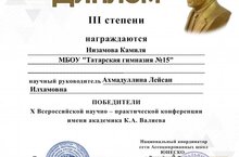 Поздравляем лауреата 3 степени Всероссийской конференции имени К.А.Валиева Низамову К. и его педагога Ахмадуллину Л.И.. Желаем новых побед!
