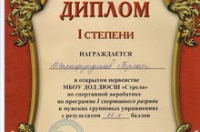 Дипломом I степени наградили Шарафутдинова Булата, который получил 42,4 балла в мужских групповых упражнениях по спортивной акробатике по программе I мпортивного разряда в открытом первенстве МБОУ ДОД ДЮСШ "Стрела".