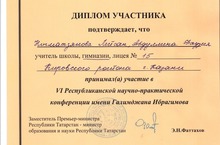 Дипломом участника наградили Нигматзянову Лейсан (ученица 11 кл.) и Абдуллину Ф.М. (учитель татарского языка) за участие в VI Республиканской научно-практической конференции имени Галимджана Ибрагимова.