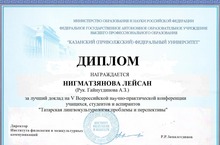 Поздравляем ученицу 11 класса Нигматзянову Лейсан (рук. Гайнутдинова А.З.). Ее наградили дипломом за лучший доклад на V Всероссийской научно-практической конференции учащихся, студентов и аспирантов "Татарская лингвокультурология: проблемы и перспективы".