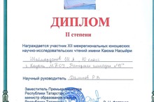Поздравляем ученика 10 класса Шаймарданова Ш.А. дипломом II степени в XII межрегиональном юношеском научно-исследовательском чтении имени Каюма Насыйри! Руководитель Даминов Р.В.
