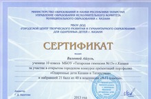 Сертификат был вручен ученицы 10 класса Валеевой Айгуль. за участие в открытом городском конкурсе презентаций портфолио "Одаренные дети Казани и Татарстана".