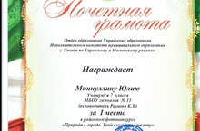 Ученицу 7 класса Миннуллину Юлию (рук. Резцова К.З.) наградили почетной грамотой за I место в районном фотоконкурсе "Природа в городе. Твой взгляд на красоту"