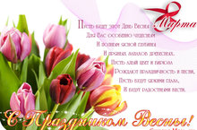 Поздравлем с чудесным праздником, с праздником женской красоты и очарования, с праздником весеннего вдохновения и светлой радости. В день 8 марта от всей души желаем постоянного ощущения счастья, ежедневного веселья души, волшебных чувств любви и нежности, прекрасного настроения и непобедимого интереса ко всему новому в жизни.